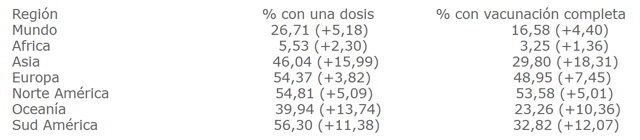 El ritmo de vacunación aumentó, es posible que a fin de año alrededor del 50% de la población está con al menos una dosis vacunal y el 25% con dos dosis. Pero las diferencias entre países y regiones es abismal. Hace 32 días, en "Vacunas, viajes, turismo, organismos internacionales...complicada nueva realidad", reiterábamos que "La realidad es una, y muestra cómo esta enfermedad ha ahondado los contrastes en el mundo." A continuación mostrábamos un cuadro con el estado de vacunación en los continentes. Actualizamos el cuadro, y al costado entre paréntesis indicamos la variación en puntos porcentuales en el período.