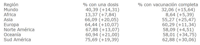 Como se puede apreciar, los continentes que más han avanzado en su vacunación han sido Oceanía en primer lugar, Sud América en segundo (pero primero en nivel de vacunación de su población) y Asia en tercer lugar, los tres continentes muy por encima de la media mundial. Lejos y por debajo de la media de avance se encuentra Europa, y si bien es el segundo continente mejor vacunado, el tiempo que ha pasado desde la segunda dosis y lo poco extendido que está el refuerzo tal vez pueda explicar el recrudecimiento de la enfermedad en ese continente. Más lejos aún en avance, pero con poco más del 58% de la población con el esquema completo está Norte América. Y África sigue siendo el continente olvidado, con menos del 10% de su población con el esquema completo.