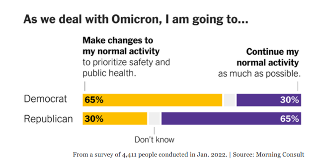 Ponemos como ejemplo una encuesta que se hizo en EE.UU., la "cuna de la democracia" para algunos (yo sigo creyendo que fue Francia), donde se preguntó el comportamiento post-Ómicron en función de su opción política. Las opciones de comportamiento eran: 1) hacer cambios en mi actividad normal, priorizando seguridad (sanitaria) y salud pública; 2) continuar con mi actividad normal tanto como sea posible. La encuesta fue publicada por el New York Times, y presentamos los resultados tal cual lo hizo este medio. Los comentarios sobran, no sabemos si se hizo algún sondeo parecido en otros países. Algún sondeo anterior publicado por el mismo medio, y cuya similitud se reitera en todo el mundo, es que entre los no vacunados la probabilidad de muerte por este virus es 40 a 60 veces mayor que entre los vacunados. Y también en EE.UU. la decisión de vacunarse o no pasó por la orientación política.