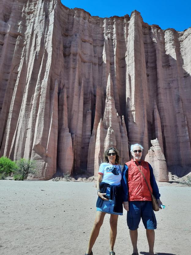 Por cierto, lo más impactante son los dos cañones con formaciones rocosas de hasta cien metros de altura y un intenso color rojizo. Primero recorrimos el que se llama “Cañón de Talampaya” y luego el llamado “Cañón del Shimpa”, que esconde una leyenda o historia, es difícil trazar un límite, del cura “Shimpa” así llamado por una larga trenza que le llegaba a su cintura.
