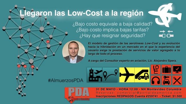 14.00 - Café y debate. Con la participación de un panel conducido por el experto en temas aeronáuticos, Licenciado Alejandro Spera y la presentación del último estudio de la consultora PDA Media & Consulting: "Llegada de las Low Cost a la región", el cual les llegará en formato PDF a vuestra casilla de coreos en las próximas horas.