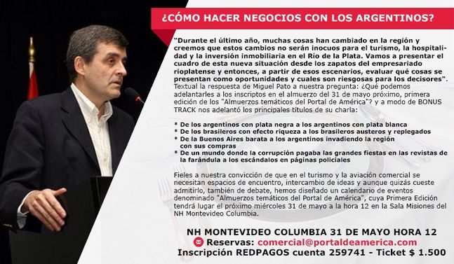 12.30 - Apertura formal del evento y reconocimiento del Portal de América, por el retiro de la actividad comercial del Gerente General de Copa Airlines; Presidente de la Cámara de Comercio de la Aeronáutica y Vice Presidente de la Cámara Uruguaya de Turismo, Hugo Perelli.