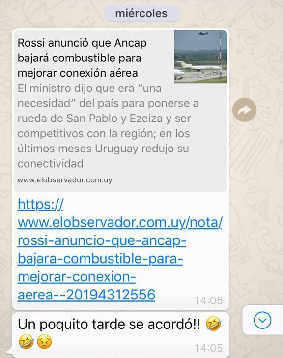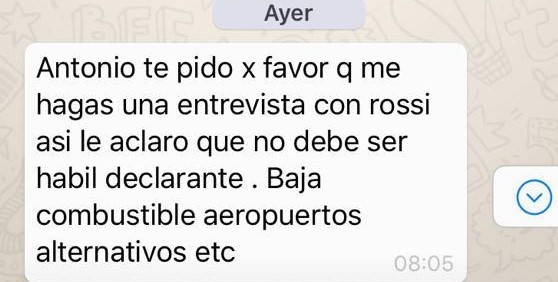 El mensaje viene de alguien que por su profesión está bien informado y si bien no es del palo aeronáutico, lo entiende y lo conoce bastante. Lo compartimos para demostrar lo difícil de entender que es el tema aeronáutico. La respuesta entonces sería: "Rossi no se acordó para nada tarde, fue el único del PE que se puso el tema sobre los hombros y bregó durante mucho tiempo para conseguir un resultado que aunque lo parezca, no llegó tan tarde. Aún se puede intentar la llegada de nuevos operadores, el problema es como siempre...¿quién rema?".