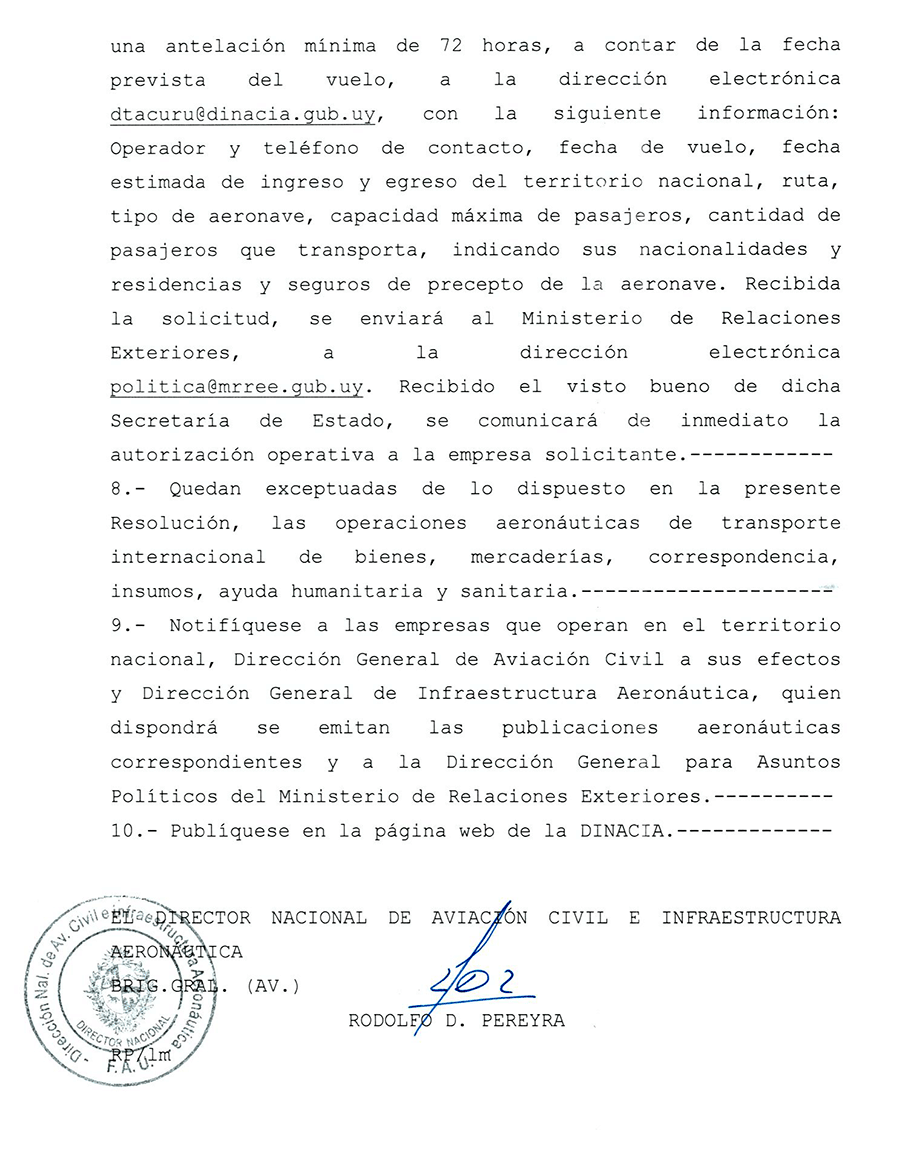 La resolución de la Dinacia 105/2020 es de fecha 25 de marzo, menos de dos semanas después de la declaración de la emergencia y es la que obliga a que todo lo relacionado a ingreso de pasajeros al país, pase por su filtro (compartimos el texto completo al final). Ya anunció su retiro, ya vinieron los que tenían que venir, lo que viene, lo tiene que resolver primero el Presidente y luego lo puede firmar como siempre, el Director de la DINACIA.