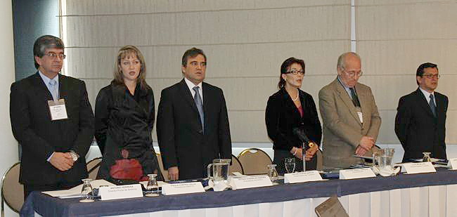 De izquierda a derecha: Sergio Antonio Herrera; Paula Cortés Calle, Presidente de ANATO; Oscar Rueda García, Viceministro de Turismo de Colombia; Nohora Isabel Vargas, Directora Instituto Distrital de Turismo de Bogotá; Lluis Mesalles, Director del Boletín Turístico y Jorge Manrique Grisales, Coordinador Académico ACOPET. Todos de pie, durante la ejecución de los himnos de: Colombia; Bogotá; España y Uruguay.
