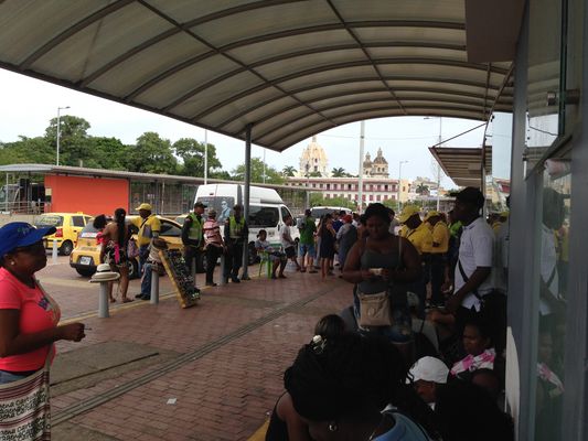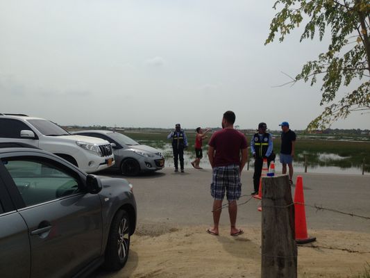 Salimos a las 11.10 por lo que calculamos la llegada a la playa para las 12. Luego de un desvío indicado por alguien no uniformado pero en este caso con remera blanca, subimos a otra carretera que en los primeros kilómetros no ofreció dificultades pero cuando eran más o menos las 11.45 comenzó "el trancón" antes del puente que da acceso a la isla de Barú. Luego de varios minutos de cabildeo entre el chofer, uno de los de remera blanca que se comunicaba por celular con la empresa y varios polícias, seguimos viaje, atravesamos el puente y a los pocos kilómetros ya desde lejos se divisaba una cortina de vehículos y gente que daba la exacta impresión de que "hasta allí habíamos llegado".