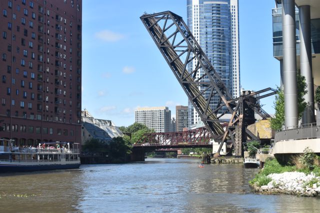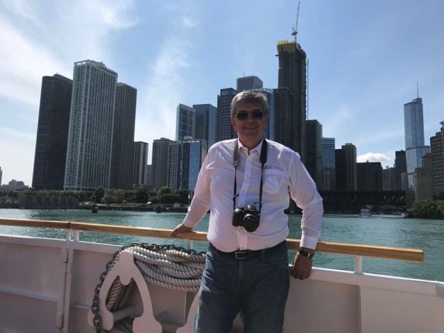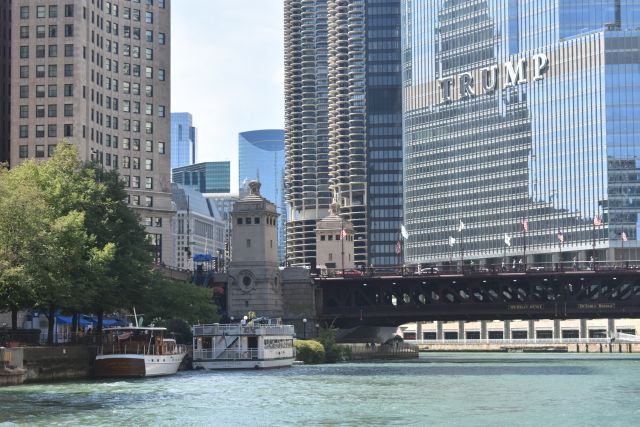 Aquí ya en otra pose y con otro rostro, paseando por el Río Chicago
