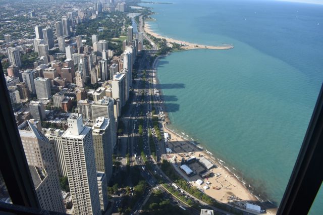 Y nos subimos a otra torre, la Hancock, son 94 pisos, 349 metros pero el Sky Walk es de terror. En el video pude tomar desde afuera a otros en el mismo. Cuando entré me hicieron dejar la cámara y el celular. Uno se para de frente al vidrio y se agarra de unas barras, de pronto esa estructura se inclina unos 45 metros hacia adelante y da para preguntarse ¿quién me mandó a venir acá?!!!. Da chucho de veras.