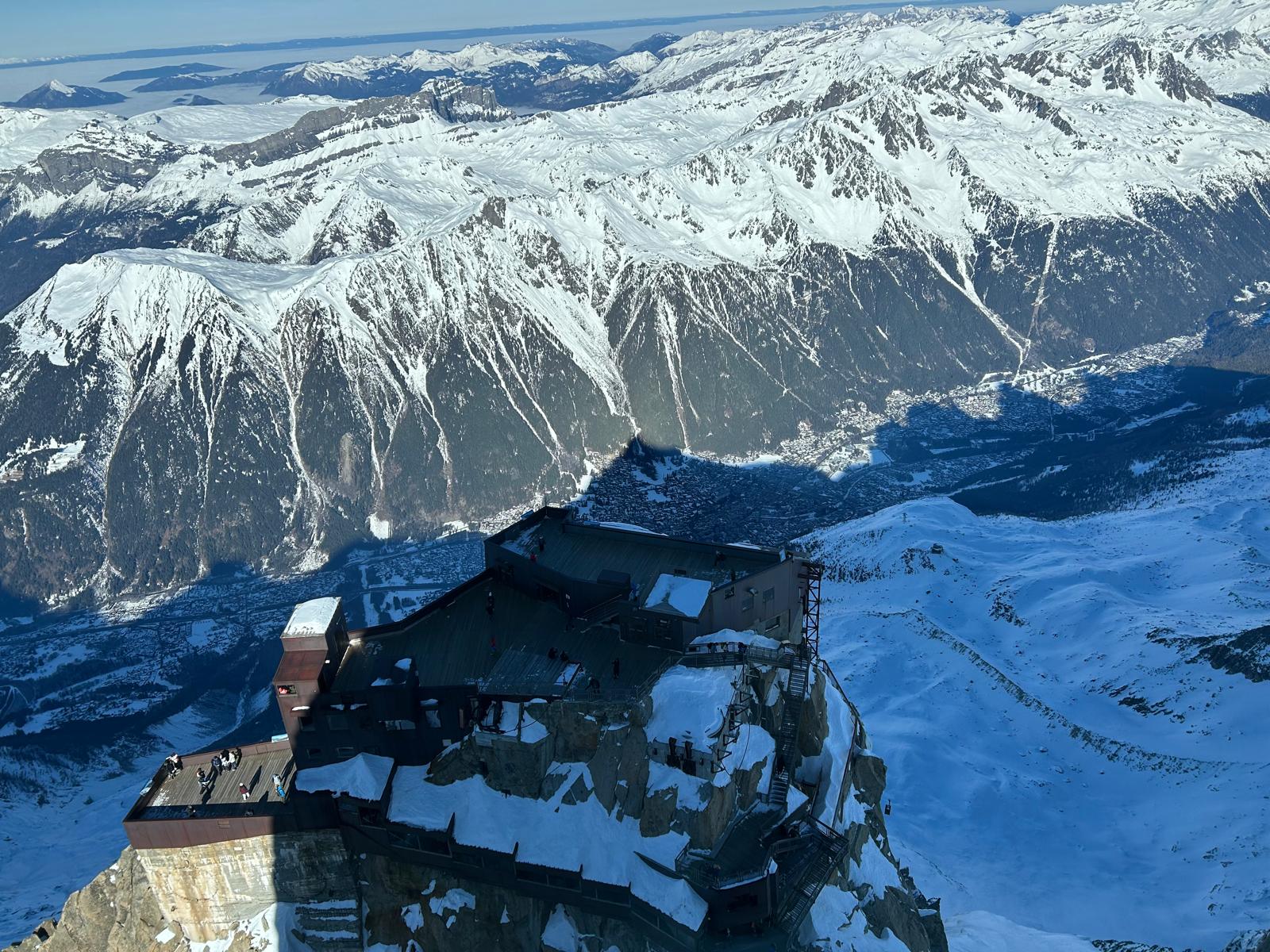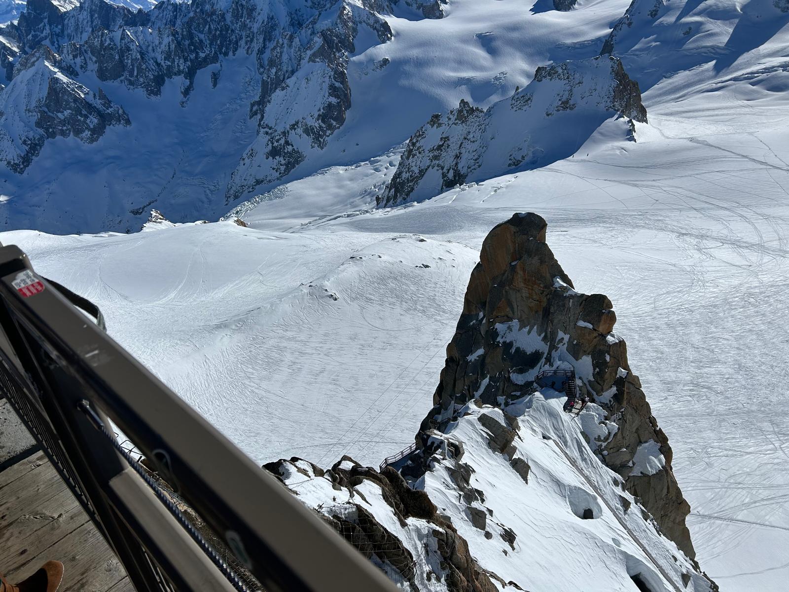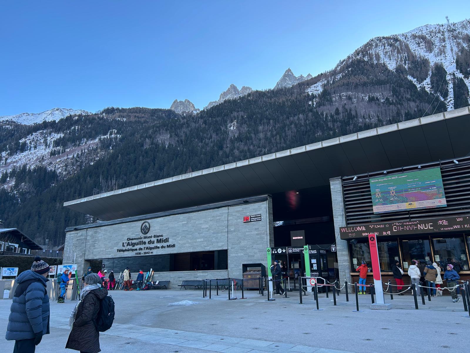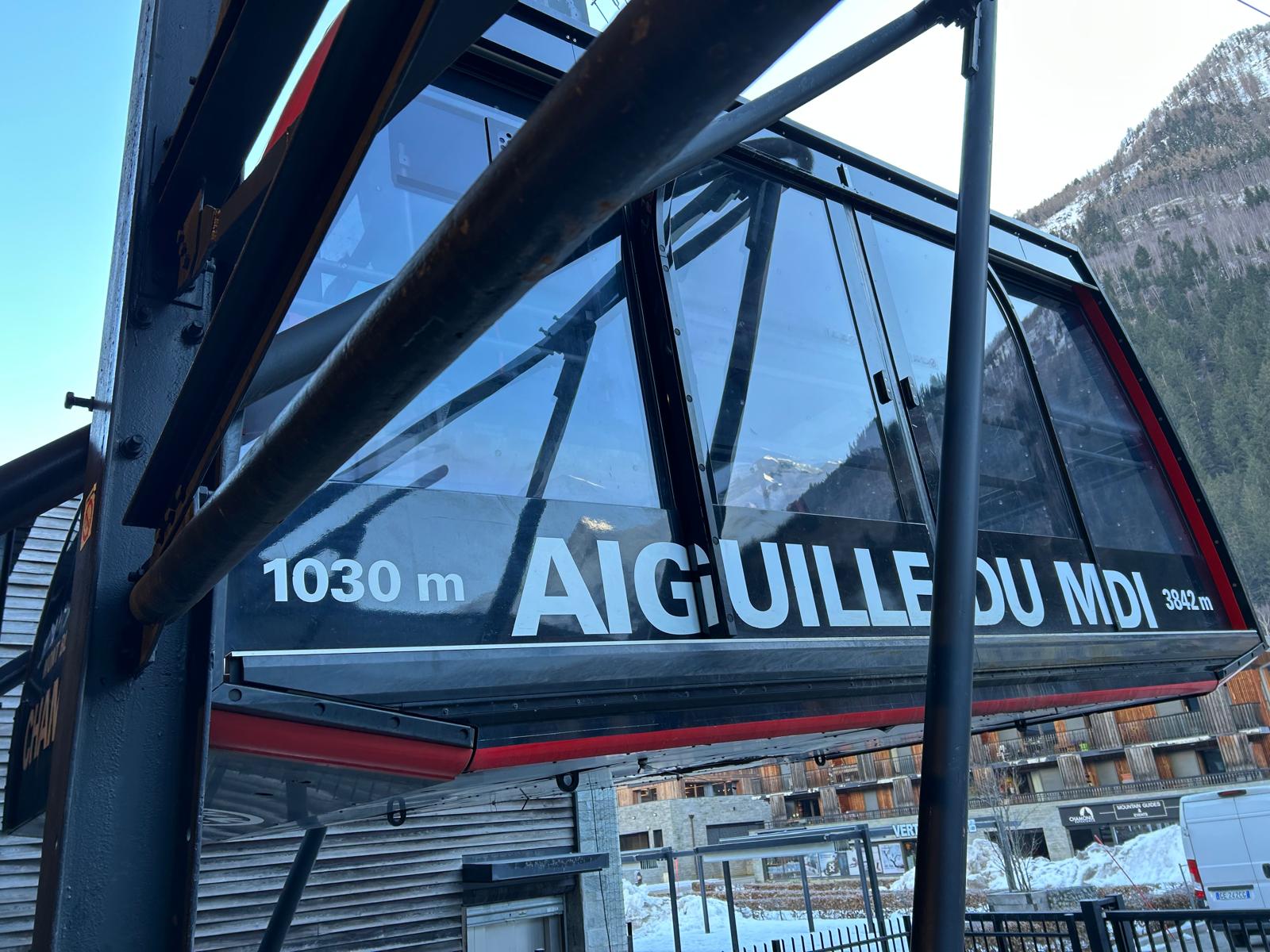 Arribamos directamente a la estación del teleférico de Aiguille du Midi, para subir desde los 1030 del lugar, en una primera etapa hasta los poco más de 2700 metros y allí trasbordar a otro vehículo para llegar a los 3842 metros de la más alta de las Agujas de Chamonix. En realidad, la cabina deja a los turistas en los 3777 metros de la estación y luego hay que hacer un tramo en ascensor hasta la cima.