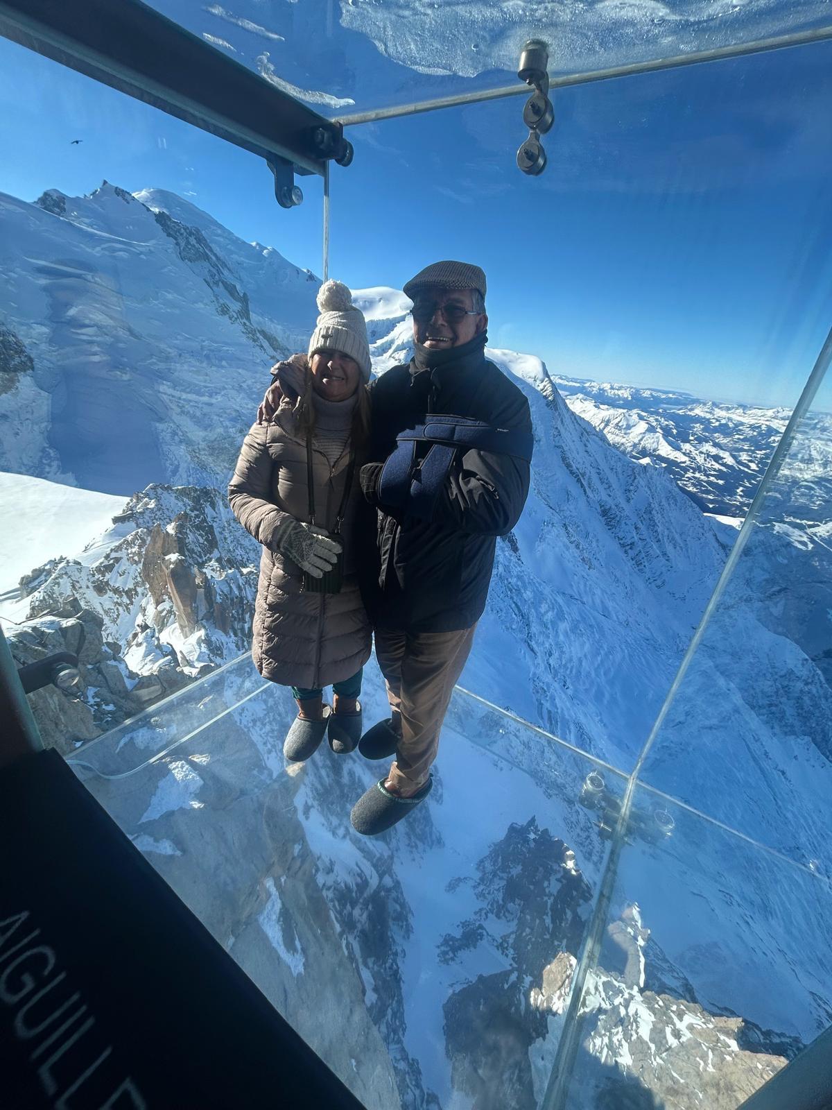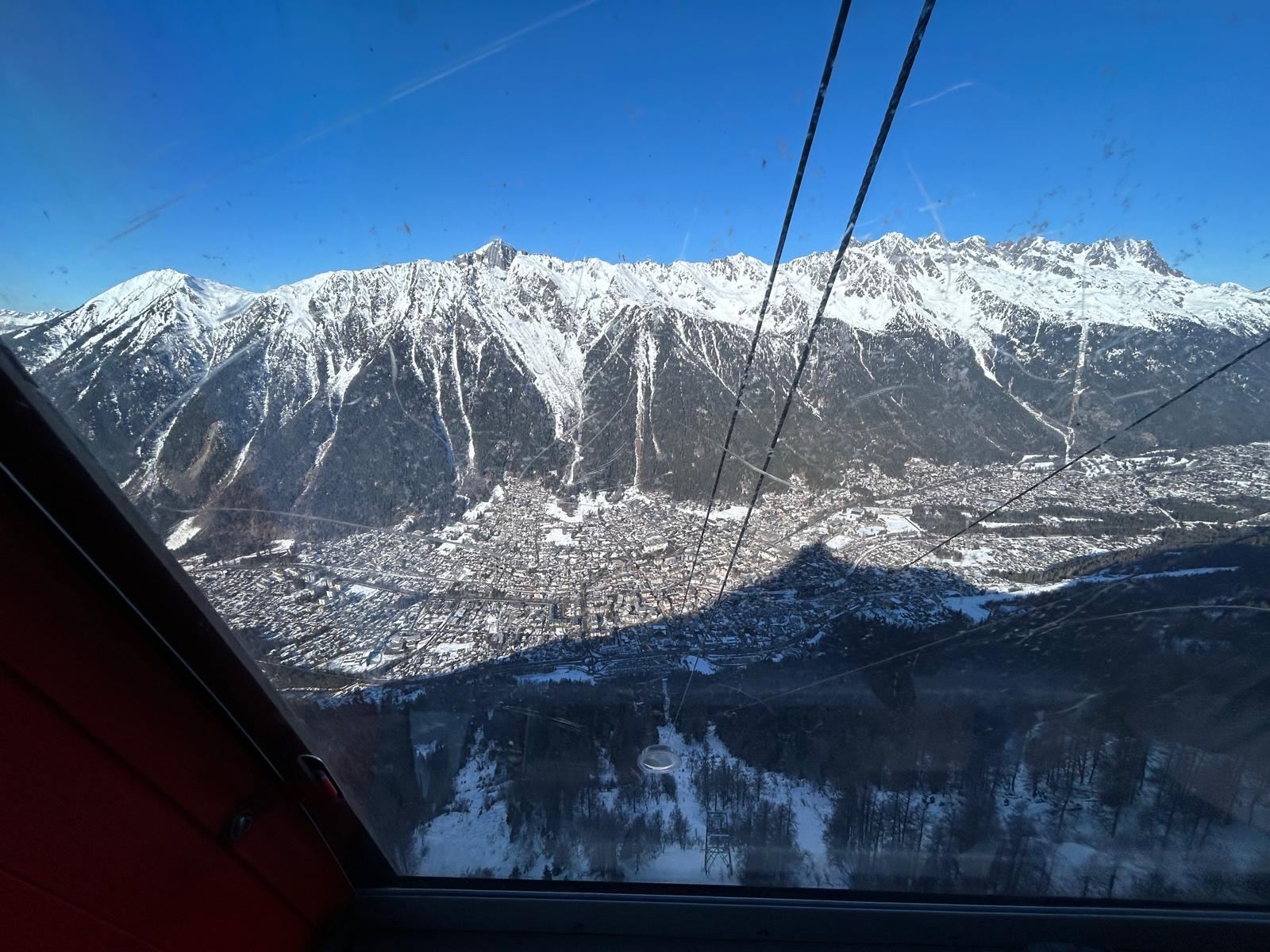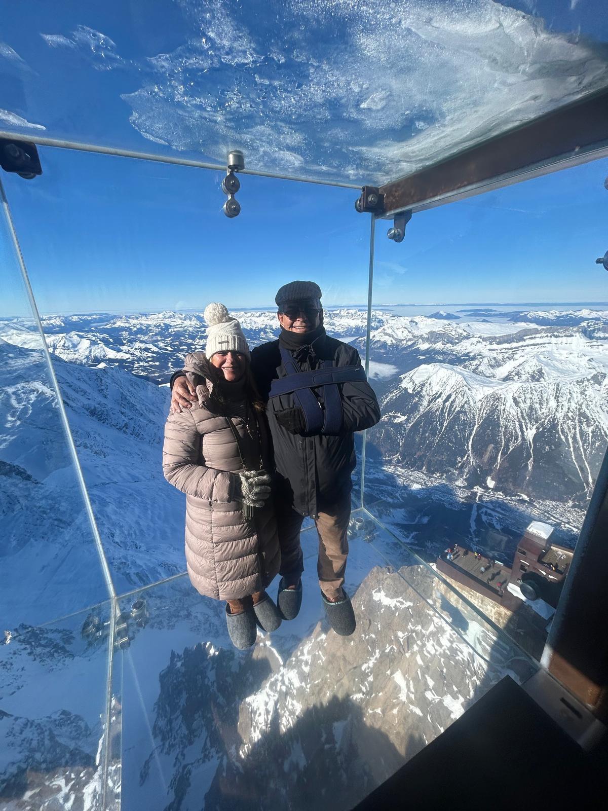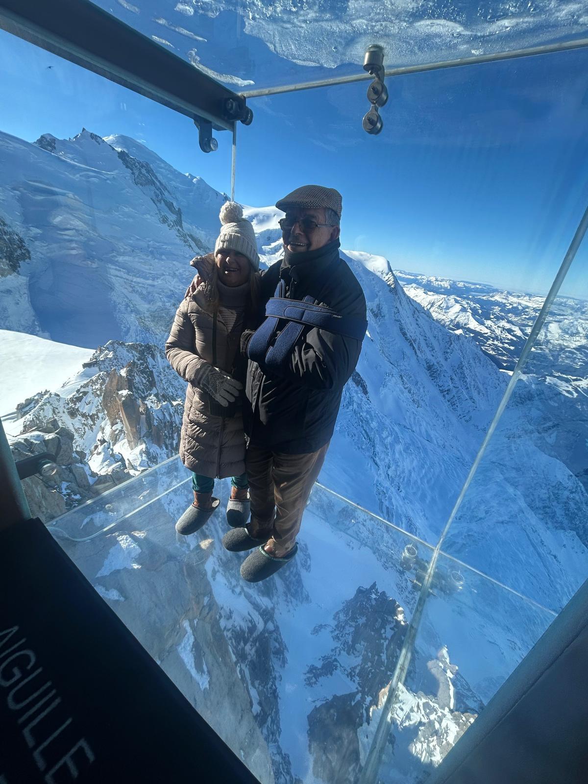 Arribamos directamente a la estación del teleférico de Aiguille du Midi, para subir desde los 1030 del lugar, en una primera etapa hasta los poco más de 2700 metros y allí trasbordar a otro vehículo para llegar a los 3842 metros de la más alta de las Agujas de Chamonix. En realidad, la cabina deja a los turistas en los 3777 metros de la estación y luego hay que hacer un tramo en ascensor hasta la cima.