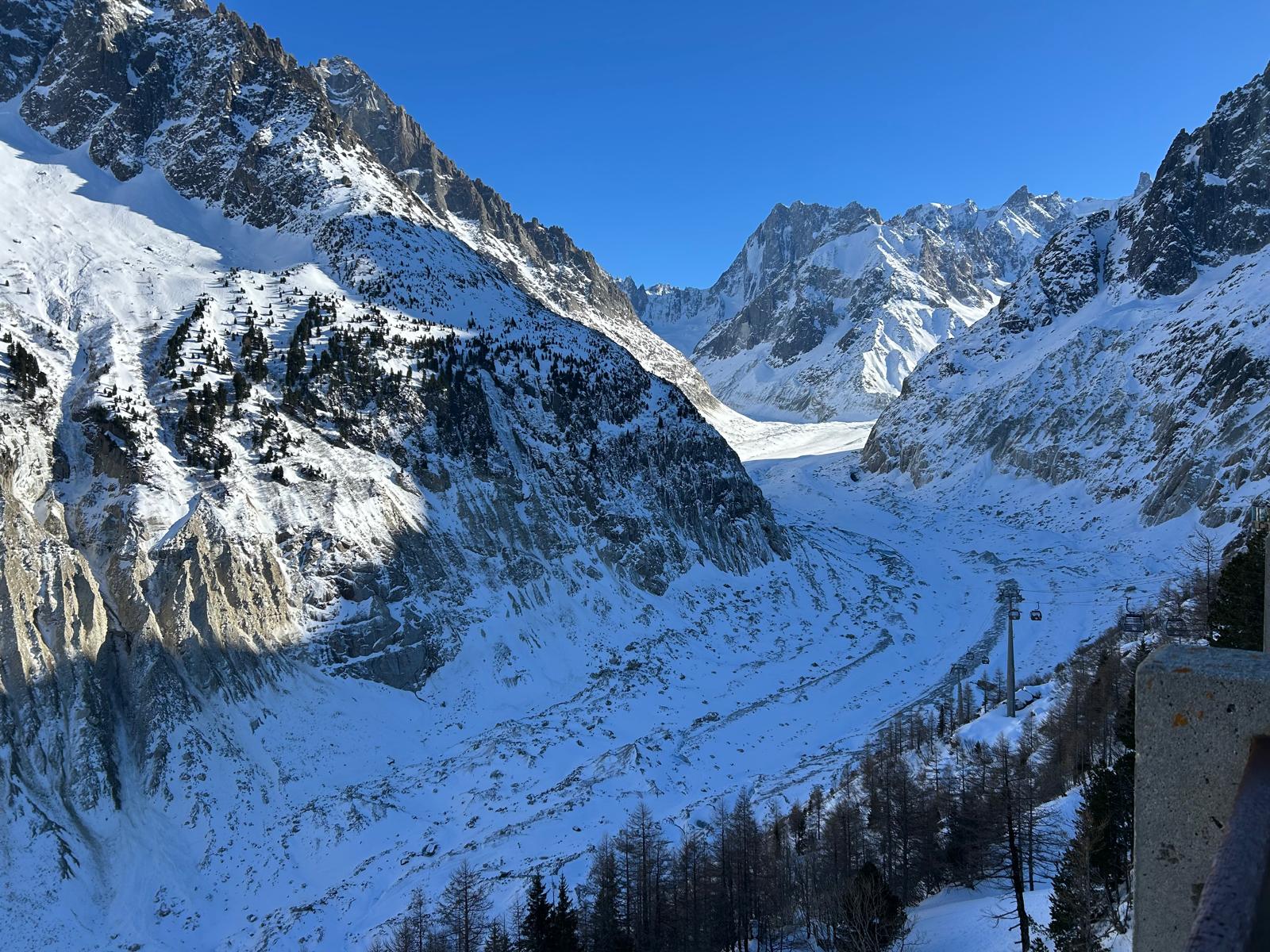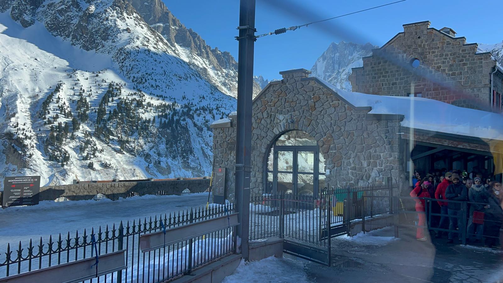 Alla fuimos caminando hasta la estación para abordar un simpático tren de montaña que no podía tener otro color que el rojo para hacer un tramo en ascenso de 25 minutos en otra ladera del Mont Blanc para llegar a La Mer de Glace, el glaciar con 7 kilómetros de largo y 200 metros de profundidad que le constituyen en el más largo de Francia. Si bien no tanto como el de la cima de la Aiguille du Midi, el frío reinante fue la excusa para tomarnos un exquisito y bien caliente chocolate.