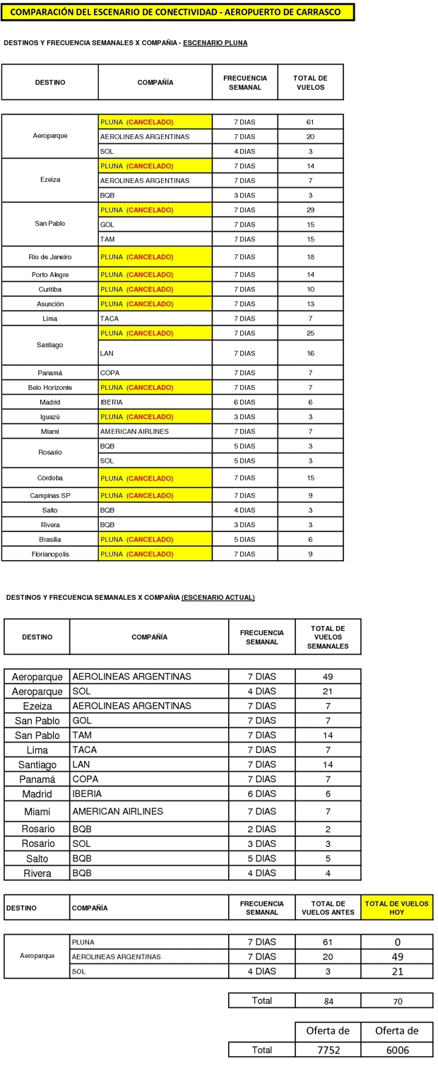 Con el cierre de Pluna, se perdieron 61 vuelos desde el Aeropuerto de Carrasco hacia Aeroparque, en Buenos Aires, pero desde entonces Aerolíneas Argentinas ha incrementado sus vuelos de 20 a 49, y la empresa Sol de 3 a 21 vuelos.