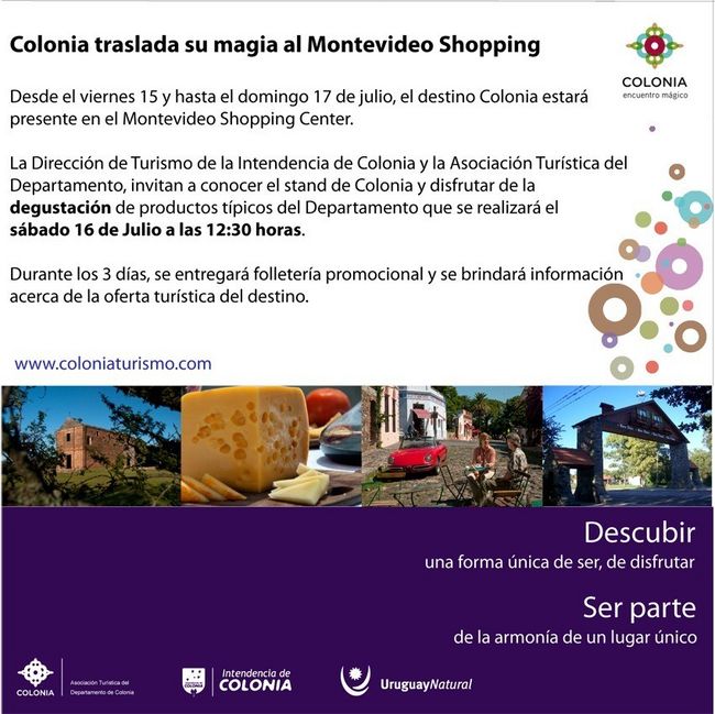 El próximo fin de semana, será casi obligatorio pasar por el Montevideo Shopping, ya que Colonia, mediante el montaje de un stand, invita a conocer sus atractivos y a degustar sus sabores.