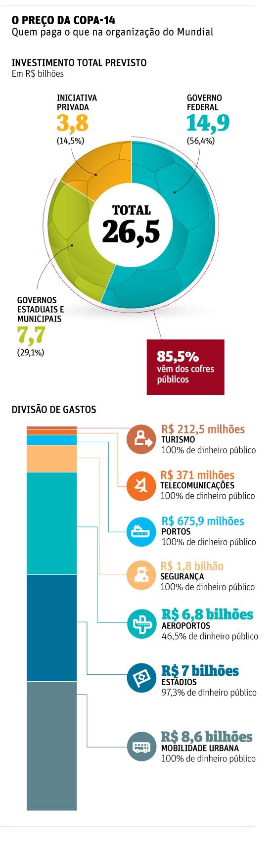 De todo el dinero que será desembolsado para celebrar la Copa del Mundo, sólo R$ 3,8 mil millones serán financiados por el sector privado. Otros R$ 14,9 mil millones serán financiados por el gobierno federal a través de préstamos o inversiones directas en las obras. El resto, R$ 7,7 mil millones, saldrán de los Estados y de las ciudades anfitrionas.