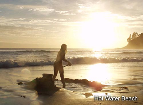 El baño: "Sin dolor no hay ganancia" es el lema en esta singular playa justo al sur de la North Island, Mercury Bay: usted tiene que traer una pala y cavar su propia "bañera caliente", que durante dos horas antes y después de la marea baja se llenará de aguas termales mezcladas con calcio, magnesio, potasio, sílice, y el flúor. Nota: también llevar un balde para añadir agua de mar fría para regular la temperatura, que puede surgir a unos escaldados 64° C.