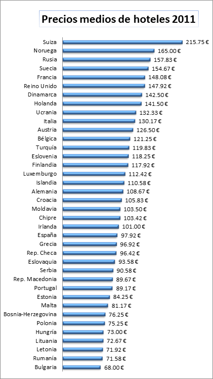 España es con estos datos, uno de los países con precios de hoteles más bajos de Europa occidental, donde una habitación para dos personas cuesta menos de la mitad que en Suiza, el país más caro de Europa con 215.75€ de media. En el top diez destacan sobre todo países escandinavos como Noruega (165€), el segundo más caro, Suecia (154.67 euros), y Dinamarca (142.50€); y países centroeuropeos, como Francia (148.08€) en el quinto puesto, seguido de Reino Unido, (147.92 euros) y Holanda (141.50€) en octavo.