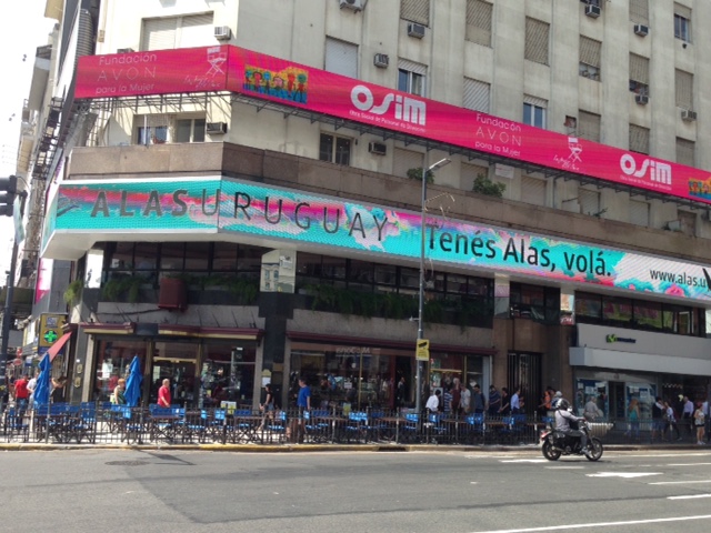 Nos habían adelantado que Alas Uruguay iba a tener una fuerte presencia la cual no se destacó. Vimos a sus directores Nicolás de los Santos y Sabrina Acevedo y a la salida personal de la empresa entregando algunos souvenirs. Compartimos la imagen del aviso colocado en una marquesina electrónica gigante de la esquina de la Avenida Corrientes casi Carlos Pellegrini, el cual aparece cada 90 segundos.