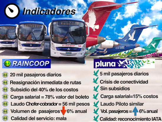 La razón es que la mayor incidencia en el valor del boleto del transporte público proviene del rubro “salarios” que se lleva el 78% de su valor. Según datos del Ministerio de Trabajo, el laudo para un chofer-cobrador es de 56.000 pesos uruguayos. En el sector aeronáutico, a pesar de la fantasía popular de que las tripulaciones suelen ganar abultados sueldos, los pilotos poseen remuneraciones muy similares a la de los choferes-cobradores y la carga salarial global no alcanza al 15% de los costos.