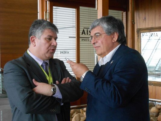 El Subsecretario de Turismo Benjamín Liberoff y la Comandante Diana Pugh quien vino a cargo del Airbus 319 y en un breve saludo a los presentes, dijo que estaba muy emocionada ya que era uruguaya y luego de volar once años fuera de su país, por primera vez lo hacía a su país, observan a Radamés Montero ofreciendo su mensaje.