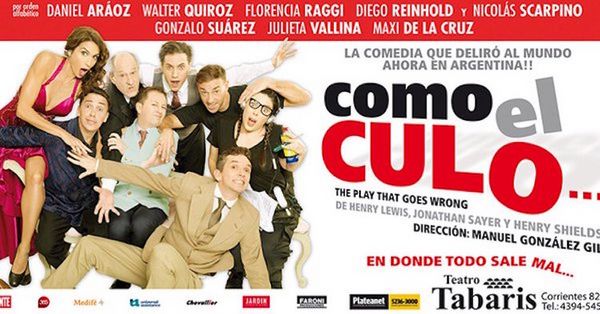 En el Tabaris, al igual que en Broadway y en Londres, se representa Como el culo (The play that goes wrong), una comedia a la que ir a ver sin cenar previamente, porque uno no para de reír desde que empieza hasta que termina, con actuaciones descollantes de Diego Reinhold, Marcelo De Bellis, Walter Quiroz, Nicolás Scarpino y un impactante Maxi de la Cruz entre otros.