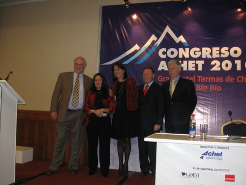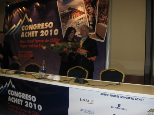 El Presidente de ACHET distinguió a la Directora de Sernatur, Jacqueline Plass, entregándole un obsequio floral y la Directiva de ACHET, por unanimidad, resolvió homenajear a la Secretaria General, Lorena Arriagada Gálvez, por su brillante gestión, causándole a la activa ejecutiva, una gran emoción por lo inesperado del gesto.