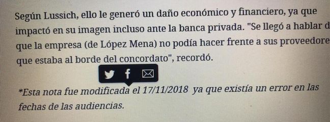 Aunque al lector le cueste creerlo, como vemos en la imagen siguiente, al pie del artículo modificado, El País colocó la siguiente llamada: *Esta nota fue modificada el 17/11/2018 ya que existía un error en las fechas de las audiencias. Una vez más, el medio escrito de mayor tiraje queda expuesto.