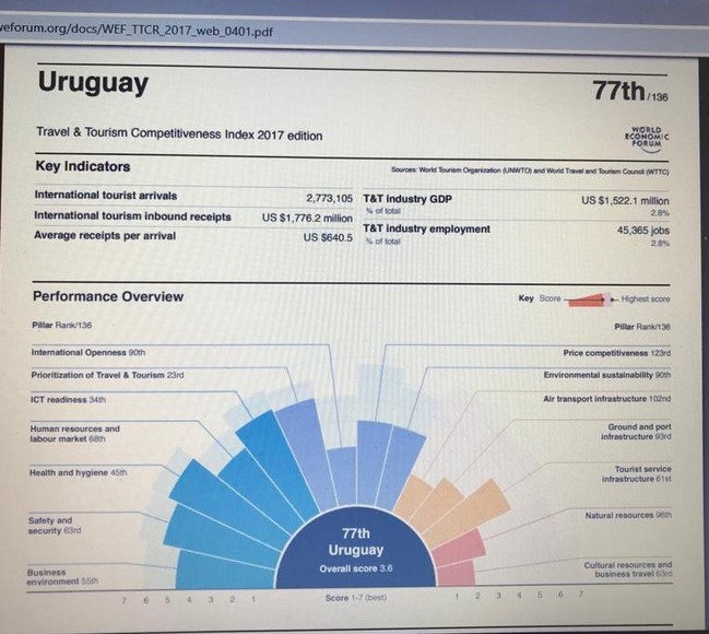 El Foro Económico Mundial, en la página 338 de su índice de competitividad de los viajes y el turismo del año 2017 decía respecto a Uruguay: