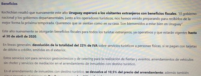 NOTA: Sobre la medianoche de este jueves 17 de octubre, buscando en la web del Mintur, encontramos en la noticia del lanzamiento en la FIT, fechado el 8 de octubre, titulada "En Argentina Uruguay lanzó la temporada de verano con importantes beneficios", bajo el subtítulo BENEFICIOS lo siguiente: "En el arrendamiento de inmuebles con destino turístico, se devuelve el 10,5% del precio del arrendamiento"... aunque usted no lo crea.