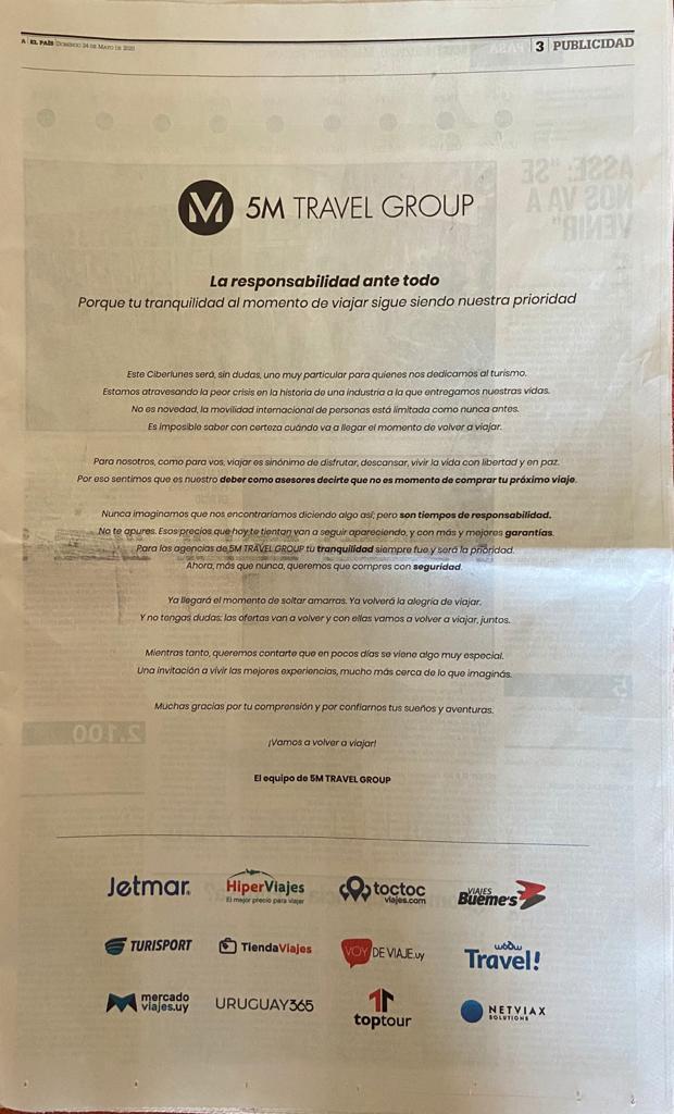 A nivel local, como ya lo informamos, 5M Travel Group, en la persona del propio Beer, ha protagonizado, ha liderado y sigue liderando, la presión a la clase política para que se sancione una ley que "decrete la emergencia turistica y que permita la creación de un fondo turístico que dé soluciones financieras para el sector y posibilite tener una cobertura para los pasajeros que puedan quedar desamparados ante el cierre de algunas empresas del sector".