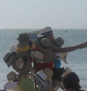 Hemos visto vender relojes, sombreros, café, pareos, diarios, revistas y en determinado momento, apareció en la playa un grupo de varios brasileños, al menos hablaban portugués y algunos llevaban camisetas de Gremio o de Flamengo, portando unas redecillas con varios productos parecidos a las papas blancas y gritando: "sándalos de la Amazooooonia"...
