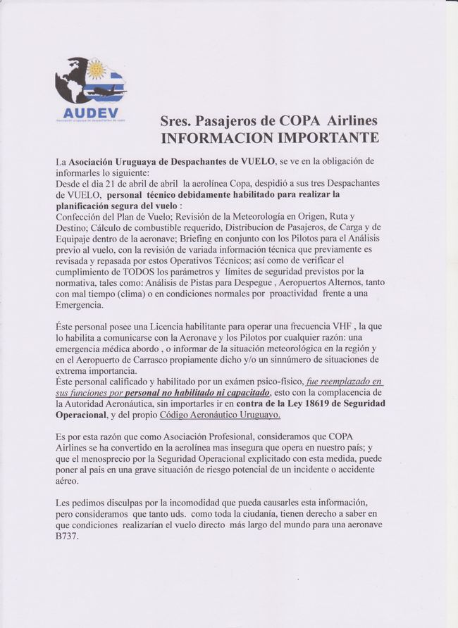 "...como Asociación Profesional, consideramos que COPA Airlines se ha convertido en la aerolínea más insegura que opera en nuestro país; y que el menosprecio por la Seguridad operacional explicitado con esta medida, puede poner al país en una grave situación de riesgo potencial de un incidente o accidente aéreo." es parte del texto de un comunicado emitido SIN FIRMA, en un documento que tiene el logo de la AUDEV, Asociación Uruguaya de Despachantes de Vuelo. Compartimos el comunicado a cuenta del artículo editorial que subiremos a este sitio más tarde. Como adelanto, debemos decir que esta actitud nos produce el más amplio rechazo, nos parece muy infeliz y de una irresponsabilidad mayúscula.