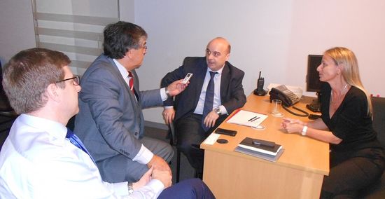 Antonio Pimentel observa mientras nos responde Gerardo Ramos Prudencio ante la atenta mirada de Evelina Pietra Vieira en las oficinas de la calle Colonia.