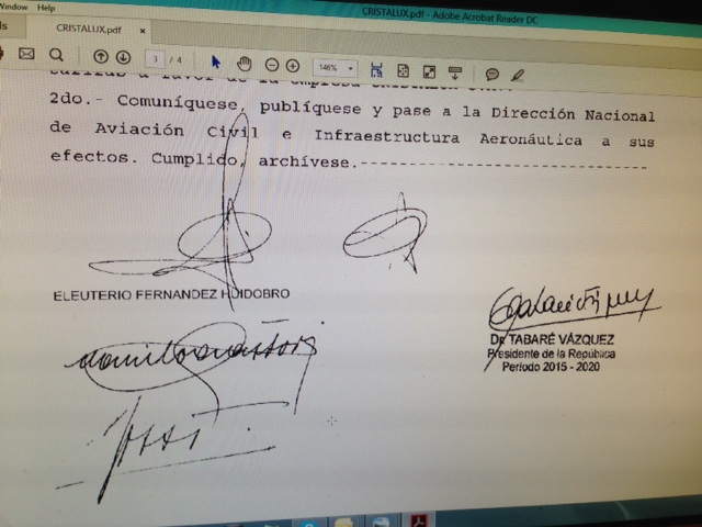 La resolución D/356 de los Ministerios de Defensa; Economía y Finanzas y Transporte y Obras Públicas fechada el 8 de agosto de 2016 lleva las firmas del Presidente Tabaré Vázquez; de Eleuterio Fernández Huidobro Danilo Astori y Víctor Rossi y documenta la cesión de Los Cipreses SA (BQB) a Cristalux SA (Amaszonas Uruguay) de las operaciones aeronáuticas de las que es titular, que incluyen la transferencia de los permisos de operación que ha otorgado nuestro país, Certificado de explotador de servicios aéreos (AOC), rutas y tarifas.