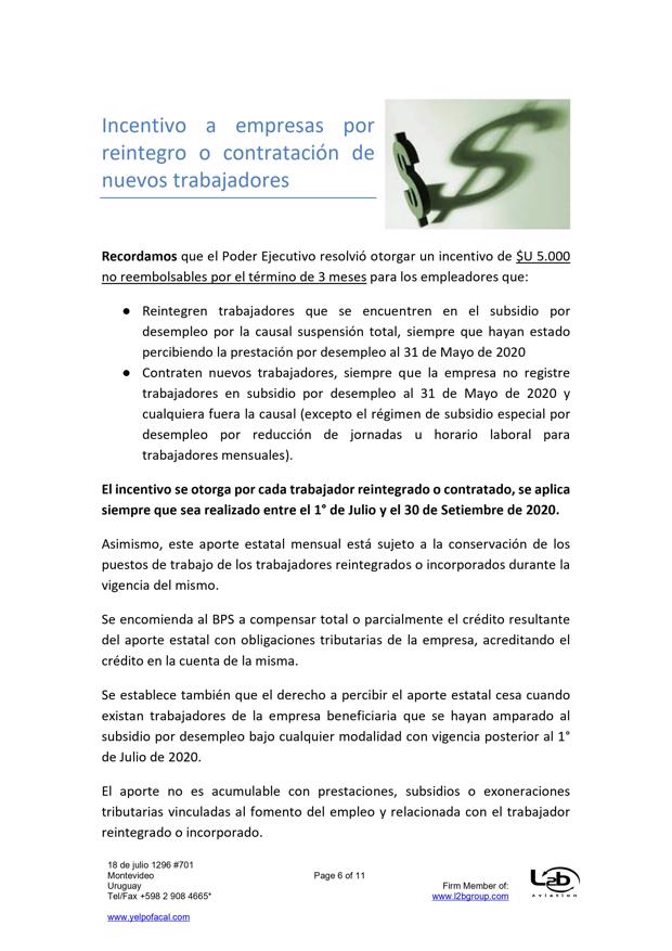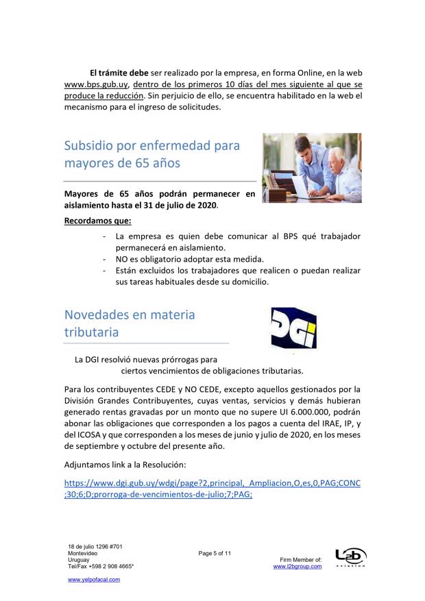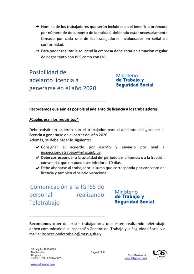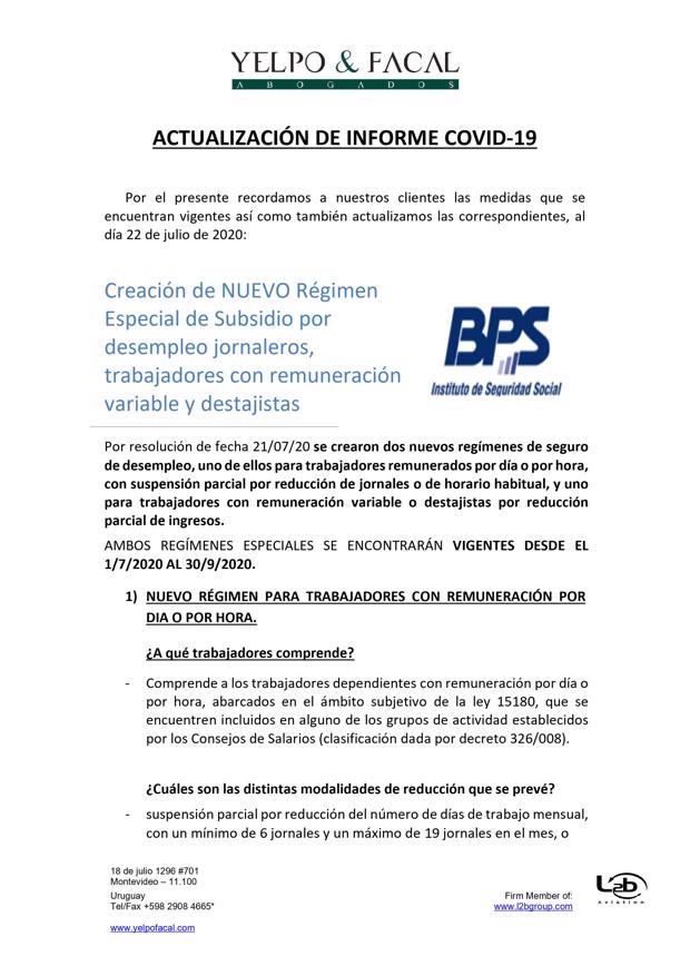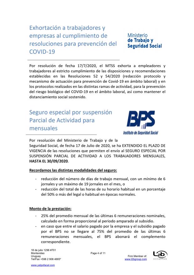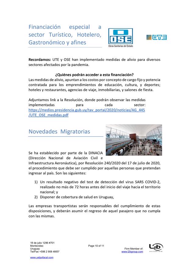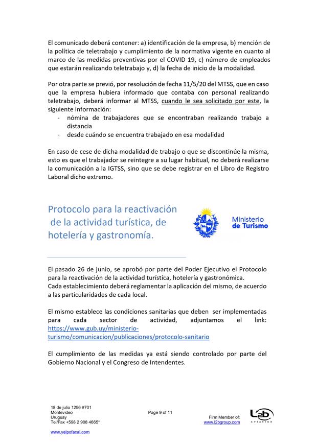 Esta es una nueva actualización (vea la anterior aqui) sobre medidas tomadas por el Covid-19. En esta ocasión se trata el reinicio de la actividad judicial, y actualizaciones de medidas del BPS, MTSS, DGI, el Protocolo para la reactivación de la actividad turística, de hotelería y gastronomía, financiación especial de UTE y OSE al sector Turístico, Hotelero, Gastronómico y afines, así como nuevas medidas migratorias.