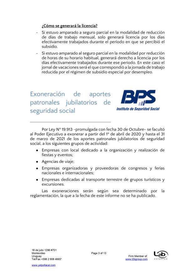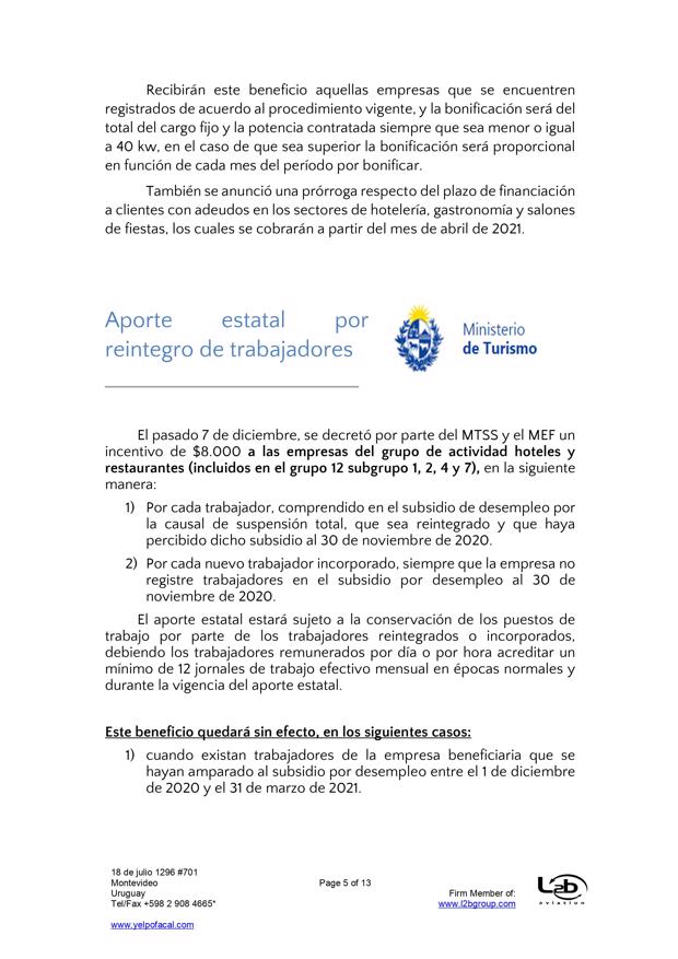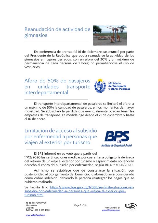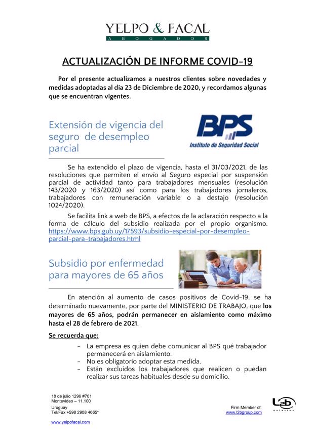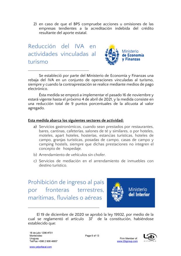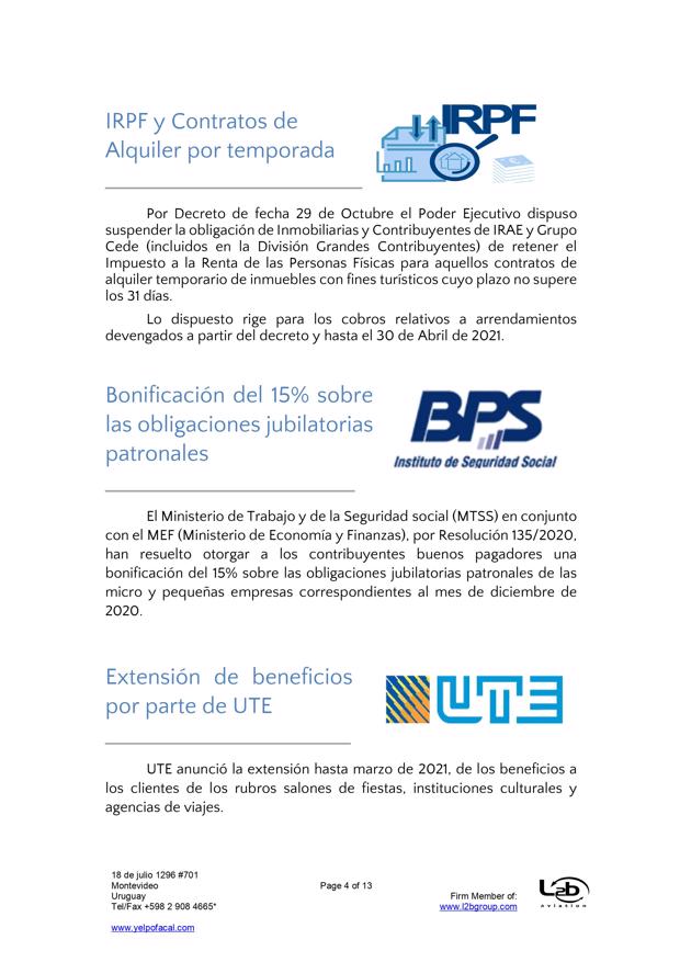 Esta es una nueva actualización (vea la anterior aqui) sobre medidas tomadas por el Covid-19. En esta ocasión se trata de actualizaciones de medidas del BPS (extensión de vigencia del seguro de desempleo, subsidio por enfermedad para trabajadores mayores de 65 años, exoneración de aportes patronales, bonificación del 15% sobre las obligaciones jubilatorias patronales, limitación de acceso al subsidio por enfermedad a personas que viajen al exterior por turismo), MTSS (posibilidad de autorizar goce de licencia generada en 2019 en el 2021, generación de licencia durante amparo al seguro por desempleo parcial), DGI (IRPF y contratos de alquiler por temporada), UTE (extensión de beneficios), Ministerio de Turismo (aporte estatal por reintegro de trabajadores), MEF (reducción de IVA en actividades vinculadas al turismo), MI (Prohibición de ingreso al país por fronteras terrestres, fluviales, marítimas o aéreas), Presidencia (limitación del derecho de reunión), MTOP (aforo de 50% de pasajeros en unidades de transporte interdepartamental).
