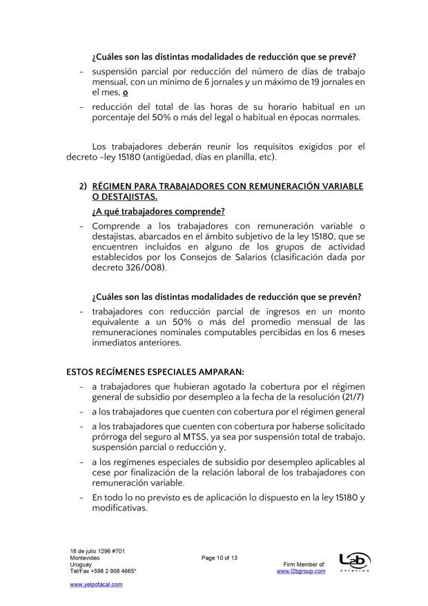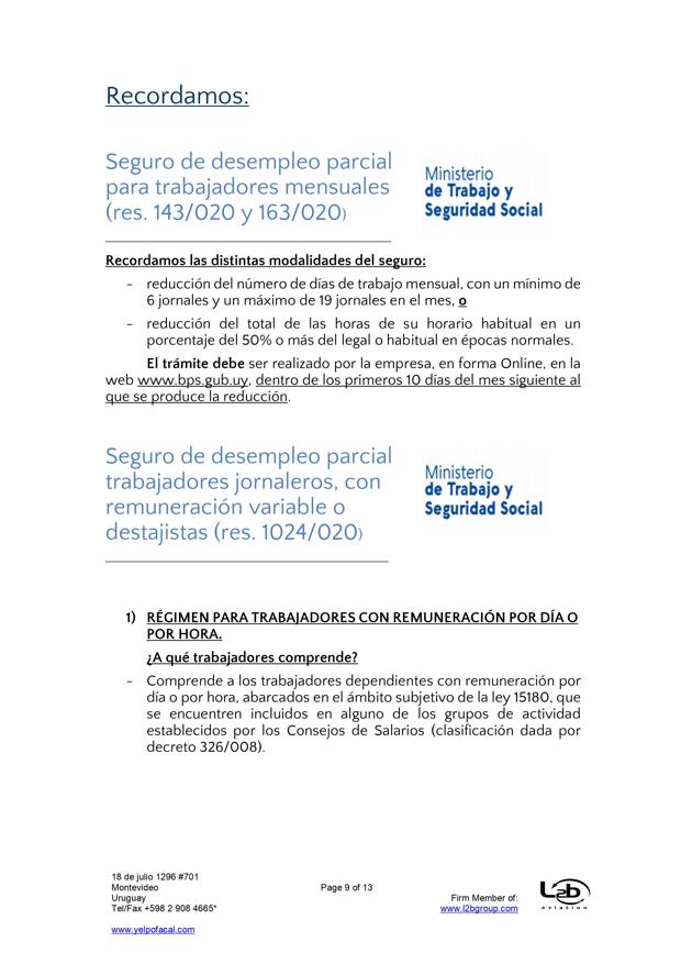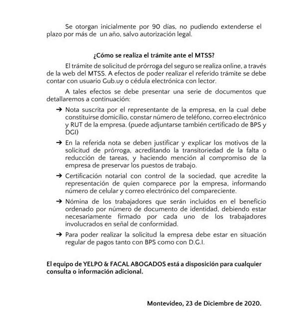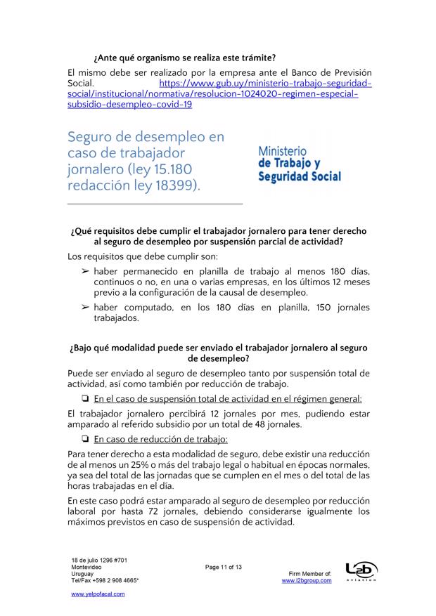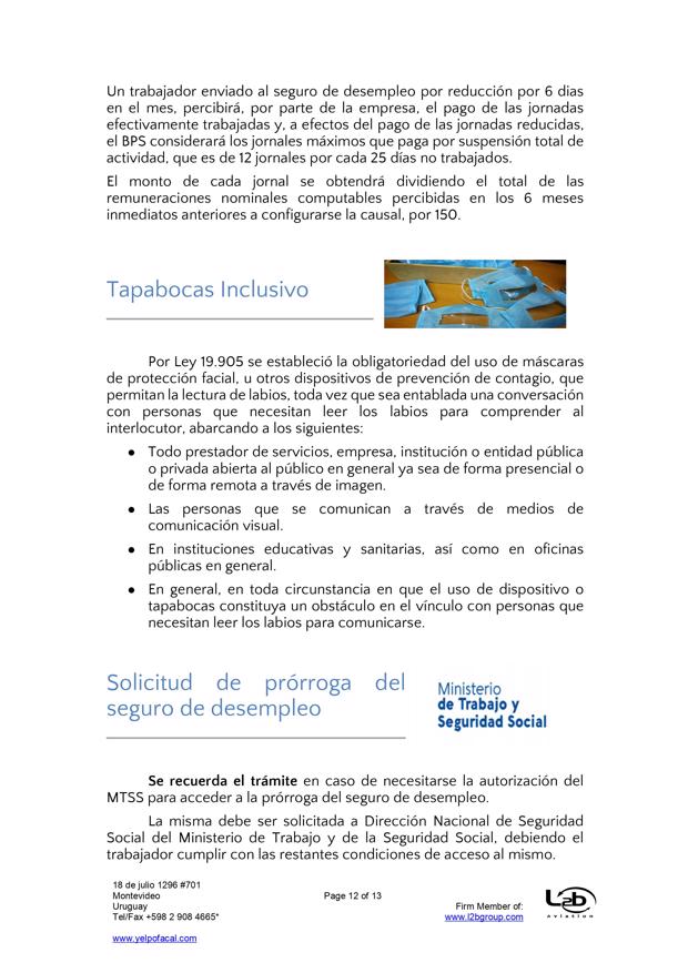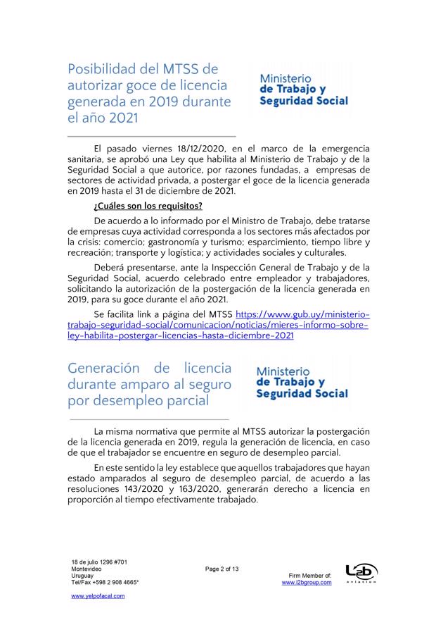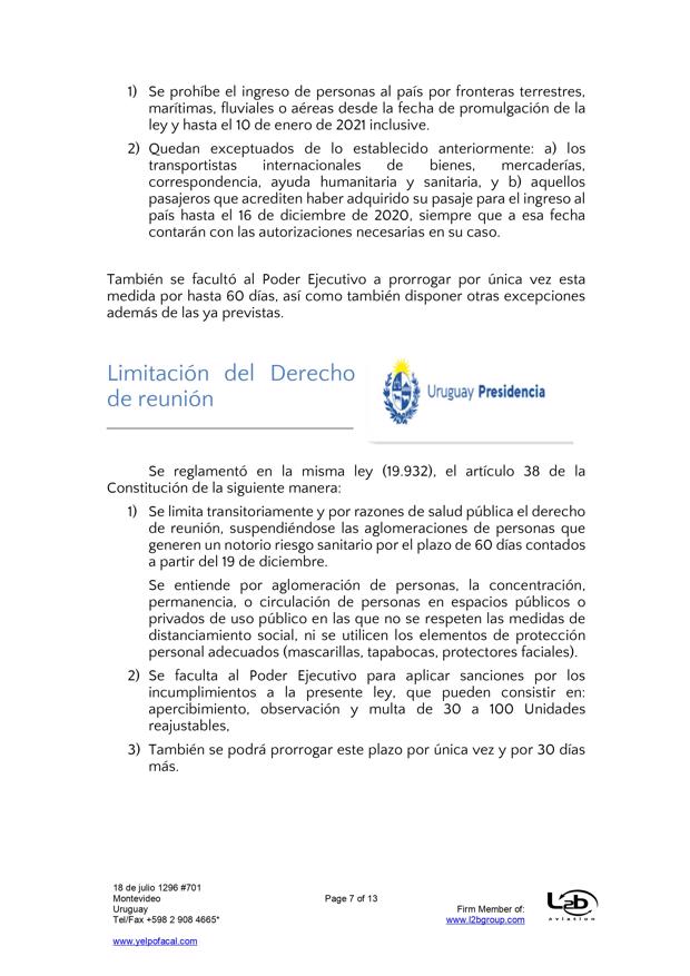Esta es una nueva actualización (vea la anterior aqui) sobre medidas tomadas por el Covid-19. En esta ocasión se trata de actualizaciones de medidas del BPS (extensión de vigencia del seguro de desempleo, subsidio por enfermedad para trabajadores mayores de 65 años, exoneración de aportes patronales, bonificación del 15% sobre las obligaciones jubilatorias patronales, limitación de acceso al subsidio por enfermedad a personas que viajen al exterior por turismo), MTSS (posibilidad de autorizar goce de licencia generada en 2019 en el 2021, generación de licencia durante amparo al seguro por desempleo parcial), DGI (IRPF y contratos de alquiler por temporada), UTE (extensión de beneficios), Ministerio de Turismo (aporte estatal por reintegro de trabajadores), MEF (reducción de IVA en actividades vinculadas al turismo), MI (Prohibición de ingreso al país por fronteras terrestres, fluviales, marítimas o aéreas), Presidencia (limitación del derecho de reunión), MTOP (aforo de 50% de pasajeros en unidades de transporte interdepartamental).