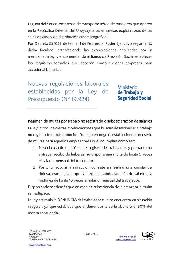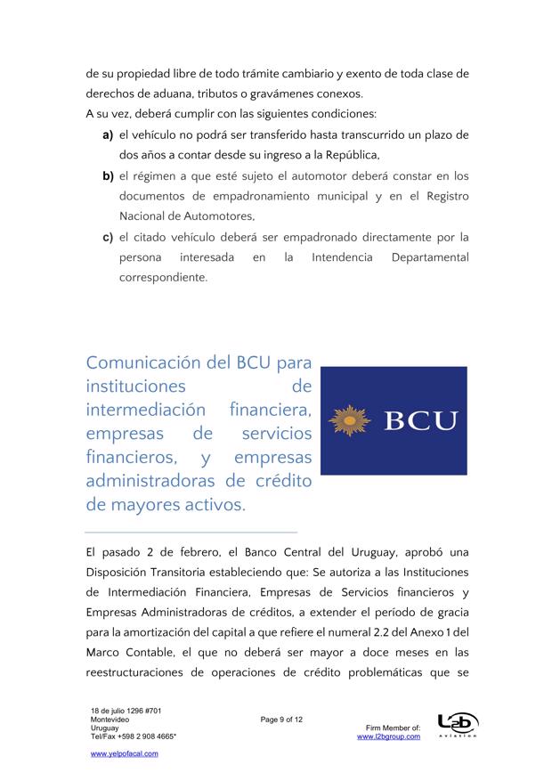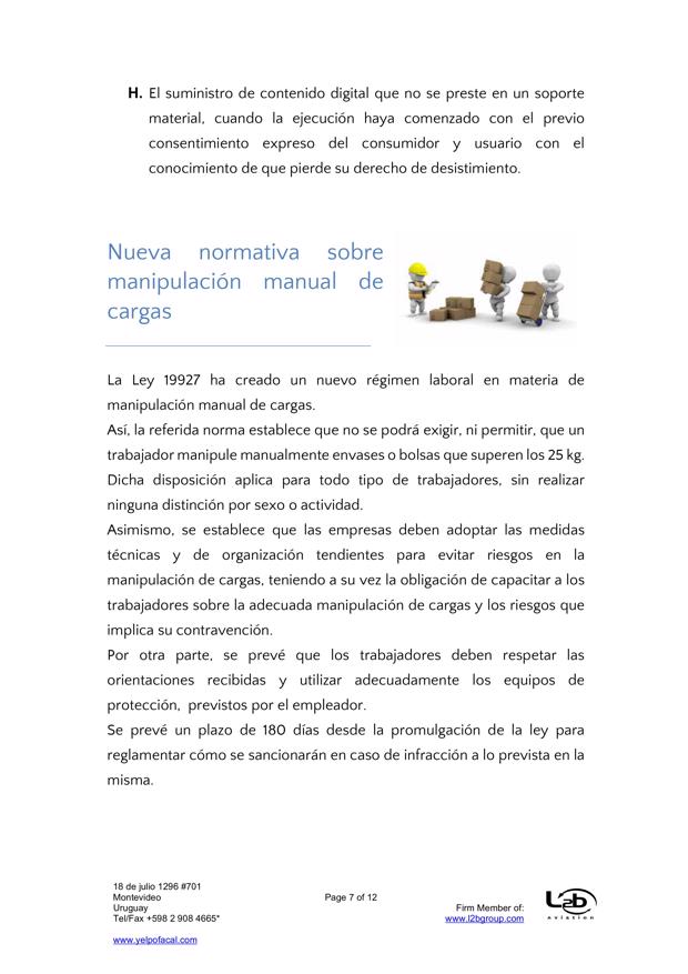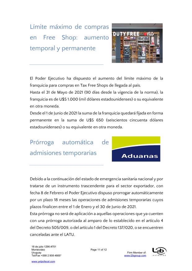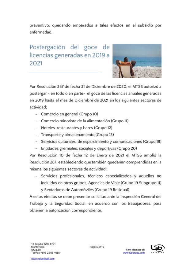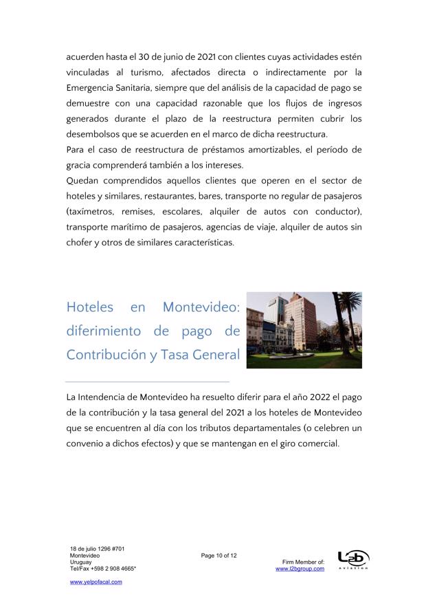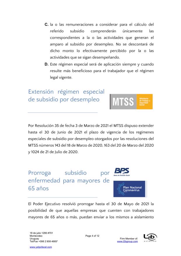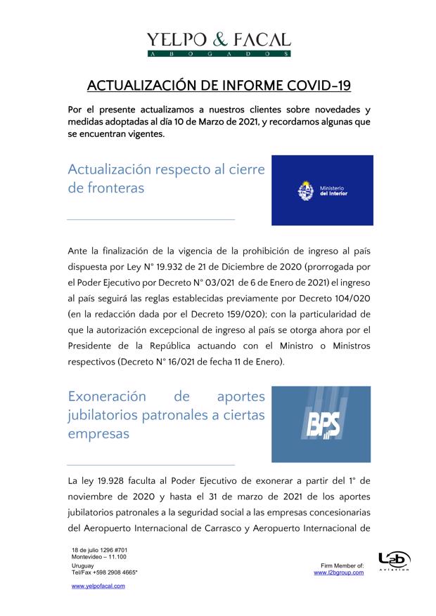 Esta es una nueva actualización (vea la anterior aqui) sobre medidas tomadas por el Covid-19. En esta ocasión se trata de actualizaciones de las medidas de cierre de fronteras, del BPS (Exoneración de aportes jubilatorios patronales a ciertas empresas, Prorroga subsidio por enfermedad para mayores de 65 años), MTSS (Régimen especial de subsidio por desempleo para Agencias de viaje, Extensión régimen especial de subsidio por desempleo, Postergación del goce de licencias generadas en 2019 a 2021), Modificación a la ley 17.250 de Defensa del Consumidor, Nueva normativa sobre manipulación manual de cargas, Ingreso de vehículos en caso de personas que ingresen al país amparadas por permiso excepcional, BCU (Comunicación para instituciones de intermediación financiera, empresas de servicios financieros, y empresas administradoras de crédito de mayores activos), Hoteles en Montevideo (diferimiento de pago de Contribución y Tasa General), Límite máximo de compras en Free Shop (aumento temporal y permanente), Aduana (Prórroga automática de admisiones temporarias) y Línea de créditos SIGA TURISMO.