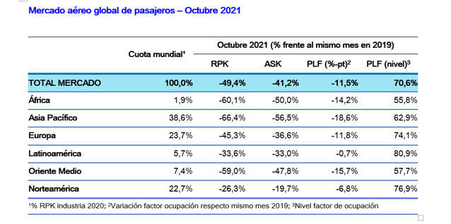 ⦁ La demanda global de octubre de 2021, medida en pasajeros-kilómetro transportados (RPK, por sus siglas en inglés), descendió un 49,4% frente a octubre de 2019. El dato mejora respecto a septiembre (-53,3% frente a septiembre de 2019).