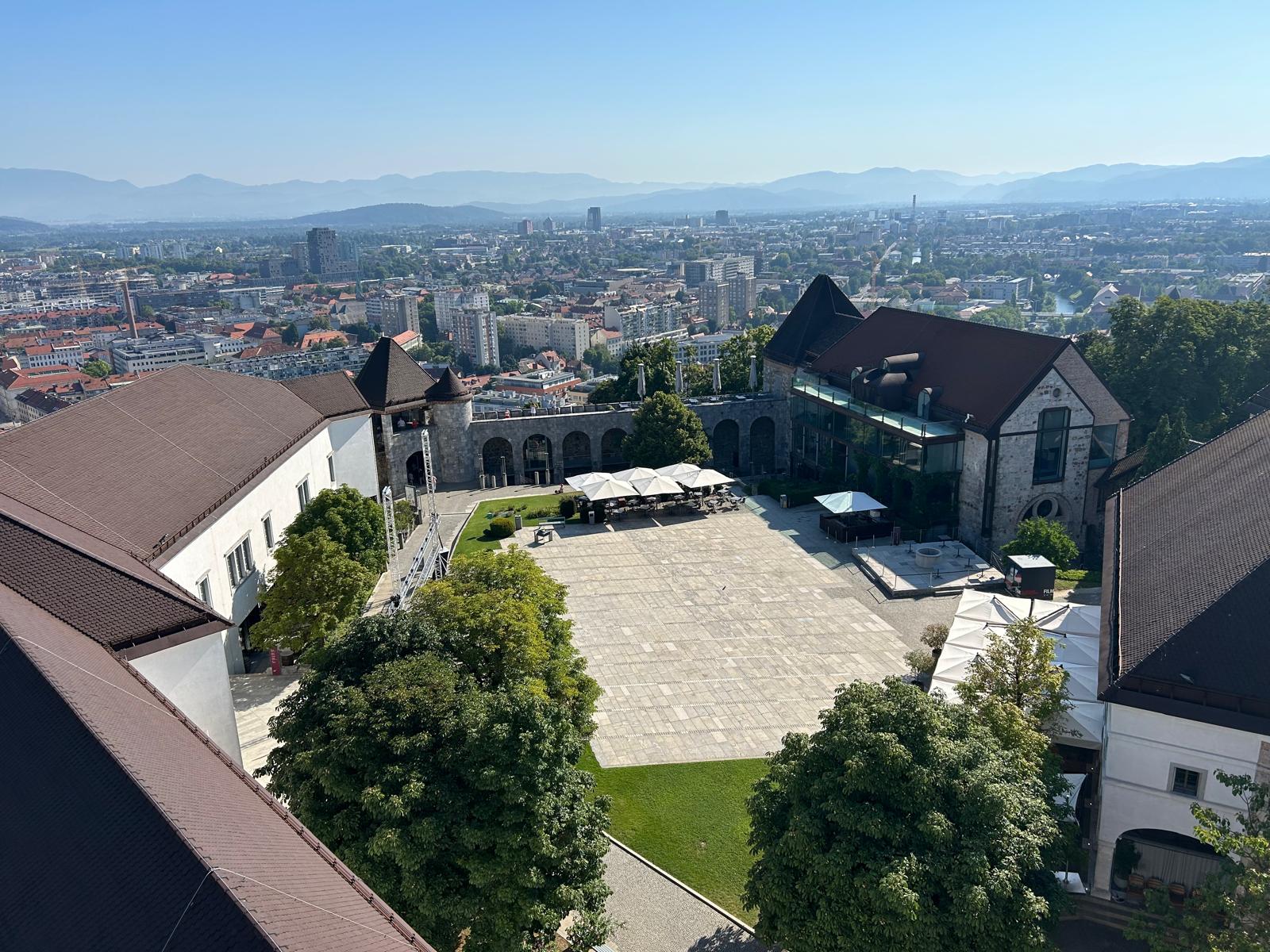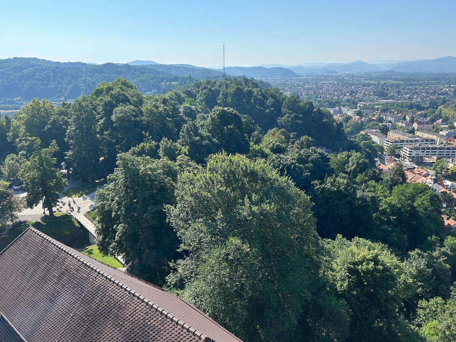 Escalera de subida a la torre de vigilancia del Castillo de Liubliana y vista desde la torre.