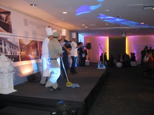 Fueron unos 10 minutos que pagaron la noche entera. Al compás de temas musicales clásicos, comenzaron a desfilar por el palco escénico, representantes de los distintos sectores del hotel, cumpliendo breves pero perfectas coreografías y para que tengan una idea de como fue, basta citar el momento en que aparecieron los funcionarios de seguridad, vestidos de negro, al compás de la música de "Misión Imposible", despertando la hilaridad del público.