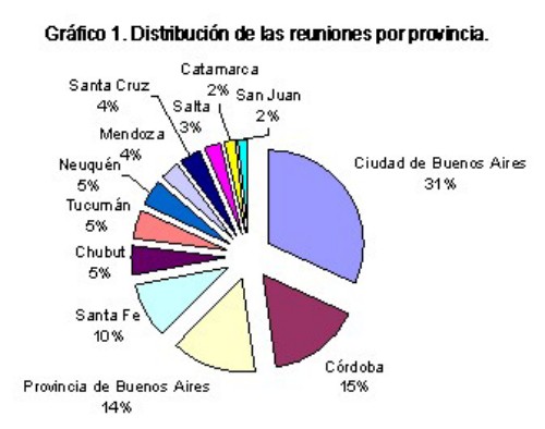 La Ciudad de Buenos Aires es sede del 32% de estas reuniones; seguida por las provincias de Córdoba, Buenos Aires y Santa Fe que convocan el 16%, el 14% y el 10% respectivamente.