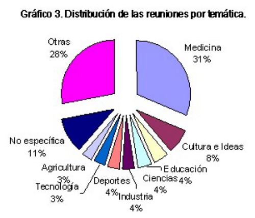 El 31% del total de estas reuniones son de Medicina y el 8%, de Cultura e Ideas. Agricultura e Industria agrupa al 7% de las reuniones; en mismo porcentaje corresponde a las reuniones de Ciencia y Tecnología.