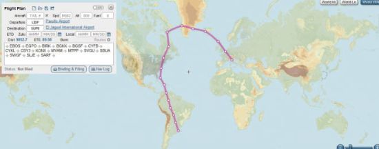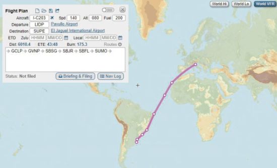 El recorrido total será de 11.200 Km, incluyendo un tramo realizado de una sola vez de 3.000 Km. El vuelo hizo tierra en tres continentes, y a su llegada a Uruguay serán 5 los países incluidos. Se estiman un total de 43 horas de vuelo. El velo se puede seguir AQUÍ.