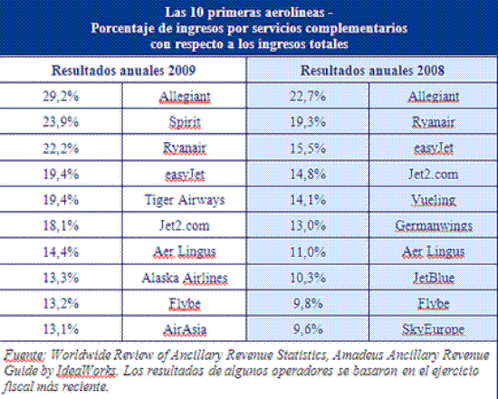 En el estudio de Amadeus Guide to Ancillary Revenue by Ideaworks, el porcentaje de ingresos por servicios complementarios con respecto a los ingresos totales de las 10 primeras aerolíneas están comprendidos entre el 13,1% y el 29,2.