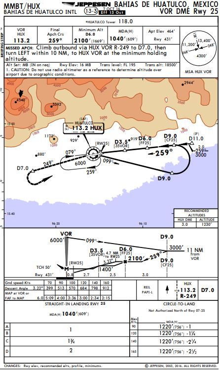 Según y como lo muestra la carta Jeppesen, el Minimum Safe Altitude (MSA), la altitud de seguridad a 25 millas náuticas del VOR de Huatulco es de 11,200 y 13,400 pies, sectores al norte de la estación donde la aeronave se encontraba volando.
