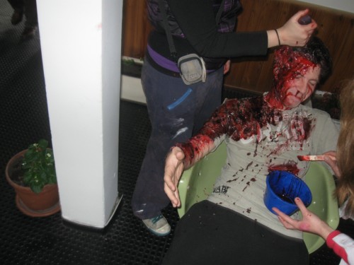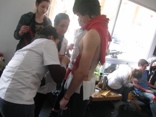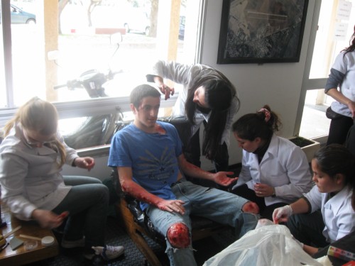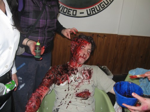 Participaron estudiantes de UTU y la Universidad Católica actuando maquillados para imprimir relismo a la situación.