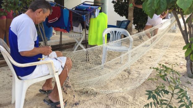 Miguel Salazar repara su atarraya, la red con la que se gana la vida pescando. Lleva 20 días sin salir a faenar.