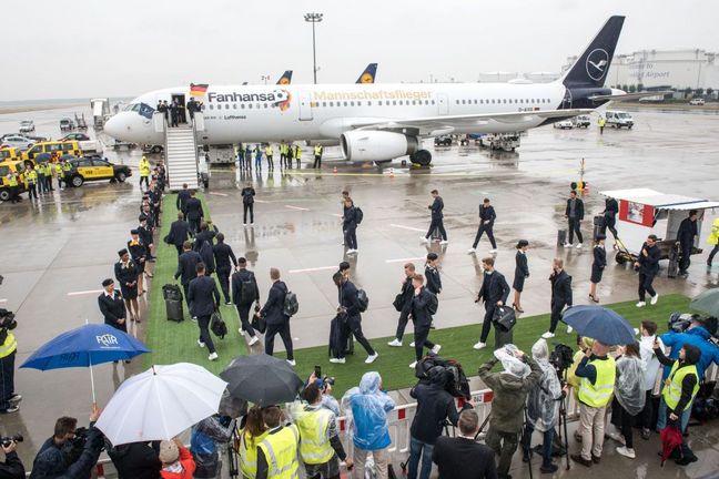 Los otros favoritos perennes no fueron tan elegantes. Vinieron en un avión no muy diferente a su marca de fútbol: Elegante pero práctico y confiable, un trabajador duro que hace el trabajo todo el tiempo. Es un Airbus A321 con los colores de Lufthansa, la aerolínea nacional, que colocó una gran pegatina en el fuselaje que se ajusta a la ocasión: Mannschaftsflieger, "el avión que vuela el equipo". Ningún alemán necesita que le digan a qué equipo estamos hablando. por aquí - Der Mannschaft está solo. El escuadrón, punto. Y en caso de que no estuviera claro que Lufthansa está tan loca por el fútbol como el resto de esta nación sobria, mira cómo cambió su nombre en el avión a Fanhansa.