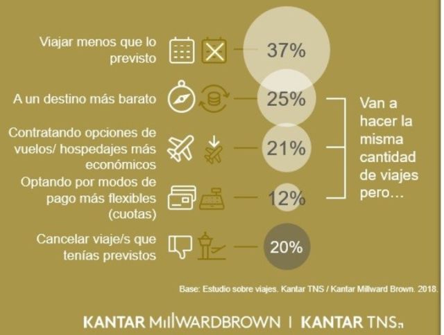 Según el reporte, el 93% de los argentinos declara haber reducido o dejado alguna categoría de consumo/gasto ante la situación económica y la fuerte suba del dólar. "Así, los viajes al exterior son uno de los hábitos que sufre, en mayor medida, una disminución de las compras afectadas por la devaluación", señaló Agustina Servente, directora de Innovación de Kantar TNS y Kantar Millward Brown.