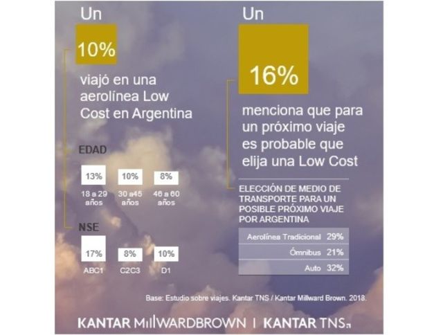 En este marco, las aerolíneas low cost ganan terreno como una nueva opción: un 10% de los argentinos ya realizó un viaje utilizando esta opción en el país, indica el informe. "Los que más probaron esta nueva forma de viajar son los segmentos extremos de la pirámide: ABC1 y D1", resaltó Rodrigo Sarti, Business Developer de Kantar TNS y Kantar Millward Brown.